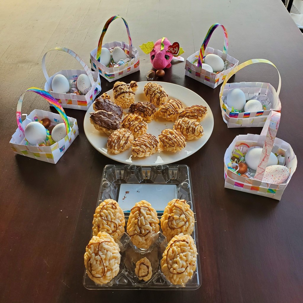 I’m not sure what I thought our Easter in isolation would be like, but our whole day surpassed what I thought the best case scenario would be! After our surprise baskets, Jen made us biscuits for breakfast, Chanelle and I created woven baskets for everyone (this was actually a very trying test on my patience), then we made the rice treats, which was followed by an amazing dinner.